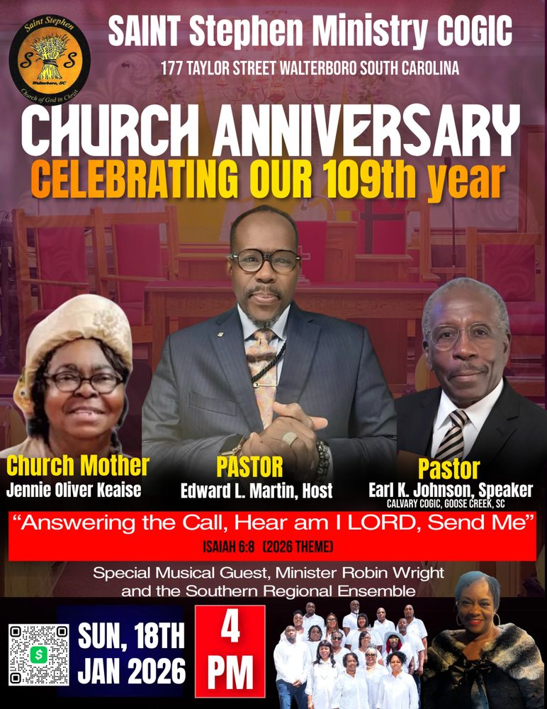 Pastor Martin was Appointed Pastor of the Saint Stephen Church of God in Christ in Walterboro, SC. Under the Leadership of Bishop Johnie J. Johnson, Prelate Emeritus